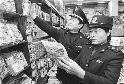 工商执法人员对商场销售的食品进行检查。为了让群众过一个欢乐祥和的元旦,山东省无棣县工商局组织人员对辖区所有商场、超市的食品安全进行专项检查。 本报记者 单保江 通讯员 蒋惠庆摄影报道