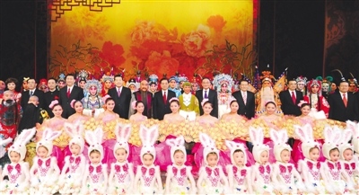 新华社北京12月30日电 (记者李斌 周婷玉) 檀板声声说盛事,鼓乐阵阵抒豪情。2011年新年京剧晚会30日晚在国家大剧院举行。党和国家领导人胡锦涛、吴邦国、贾庆林、李长春、习近平、李克强、贺国强、周永康,与首都近千名群众一同观看演出,喜迎新年的到来。