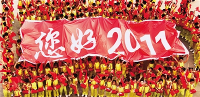 2010年12月30日,江西省靖安县双溪镇小学学生举起“您好2011”字样的横幅,喜迎新年的到来。 徐仲庭摄(新华社发)
