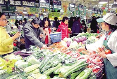 上图 1月3日,顾客在上海市长宁路上的一家大型超市内选购蔬菜。