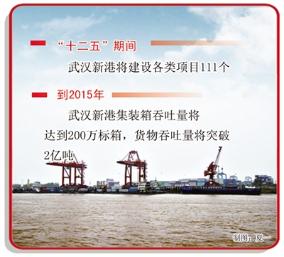 据介绍,“十二五”期间,武汉新港将建设各类项目111个,投资总概算1766亿元。到2015年,武汉新港集装箱吞吐量将达到200万标箱,货物吞吐量将突破2亿吨,初步建成集现代航运物流、综合保税服务、先进港口设施和经济技术开发于一体的现代枢纽港。