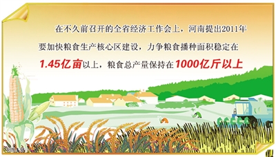 在不久前召开的全省经济工作会上,河南提出2011年要加快粮食生产核心区建设,力争粮食播种面积稳定在1.45亿亩以上,粮食总产量保持在1000亿斤以上。