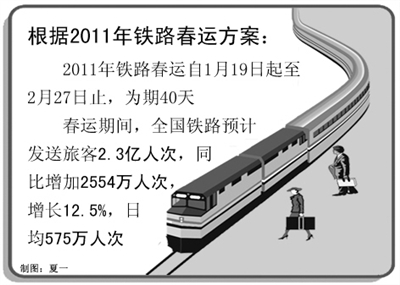 本报北京1月4日讯 记者苏民报道:2011年铁路春节旅客运输工作方案今天出台。2011年铁路春运自2011年1月19日起至2月27日止,为期40天。春运期间,全国铁路预计发送旅客2.3亿人次,同比增加2554万人次,增长12.5%,日均575万人次。其中,发送直通旅客9200万人次,同比增长11.6%。
