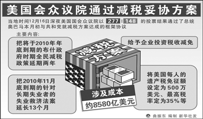 本报驻联合国记者张介岭:美国国会最终批准了政府“延长布什时代税收减免计划”议案,这对2011年的美国经济是个重要利好消息,高盛集团等因此都调高了经济增长预期。