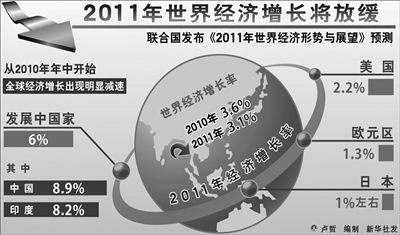 本报驻联合国记者张介岭:联合国经济与社会事务部《2011年世界经济形势与展望》预测,世界经济从衰退走向复苏过程缓慢,各国增长力度不一。从2010年年中开始,全球经济增长出现明显减速,2011年的增长很可能将更加缓慢。该机构全球经济监测部主任洪平凡说,世界经济增长的主要不确定因素,很大程度上源于发达国家居高不下的失业率、脆弱的金融系统、主权债务压力,以及主要国际货币间汇率的大幅波动。这些风险不但直接影响发达国家复苏,也可能通过国际贸易和国际金融体系冲击全球经济的稳定与增长。摩根士丹利研究主管方艾硕预测,2011年世界经济将表现出三大特点:经济增长不平衡,新兴市场经济体增长强劲,成熟经济体的复苏将表现得低迷和脆弱;各国央行大多将维持超扩张性政策;成熟经济体的主权债务问题仍然严重,欧洲主权债务危机开始影响核心国家,并且对财政赤字的担心也可能对美国造成负面影响。