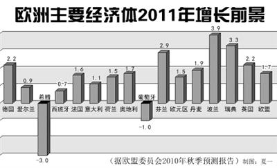 本报驻布鲁塞尔记者严恒元:2011年欧洲经济可望继续保持增长,但增速会放缓。欧盟委员会最新预测报告称,欧盟和欧元区2011年的经济增长率分别为1.7%和1.5%,低于2010年的2%和1.7%。经济学家认为,欧元区2011年的宏观经济政策将继续呈现“宽货币、紧财政”的特点。欧元区通胀率可望保持在2%左右,为欧洲央行继续实施宽松的货币政策创造条件。目前,欧元区利率已处于1.0%的历史最低水平,继续下调空间有限,因此欧洲央行今后很可能通过在公开市场上购买成员国国债的方式来实施宽松货币政策。欧元区为防范主权债务危机而实施的紧缩财政政策则是制约增长的重要消极因素。世界经济增长缓慢意味着外部需求不振,也会影响到欧元区出口。欧元区经济内部失衡导致各国经济增长出现两极分化趋势,这将是欧元区经济2011年的一大特点。欧元区经济复苏基础虽已趋稳,但不均衡。欧盟委员会预测显示,德国、英国、法国2011年的经济增长率分别为2.2%、2.2%和1.6%,而希腊、葡萄牙和爱尔兰分别仅为-3%、-1%和0.9%。