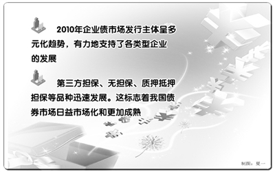 据罗毅介绍,2010年企业债市场的一大变化就是,发行主体呈多元化趋势,既有大型央企、地方大型国企、地方城投公司,也有民营企业、中小企业等,有力地支持了各类型企业的发展。2010年2月和4月,国家电网公司相继发行300亿元和100亿元企业债券;2010年8月,中石油成功发行200亿元的企业债券,其中10年期品种发行利率仅为3.95%,这是中石油继其股份公司在2003年、2006年发行企业债券后重新登陆企业债券市场,进一步凸现了企业债券市场发行主体多元化的特征。