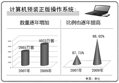 据透露,自2006年开展此项工作以来,已取得了显著成效。计算机预装正版操作系统的数量逐年增加,比例也逐年提高。由2007年预装数量2665万套,比例87.75%,提升至2009年预装套数4023万套,比例98.02%。