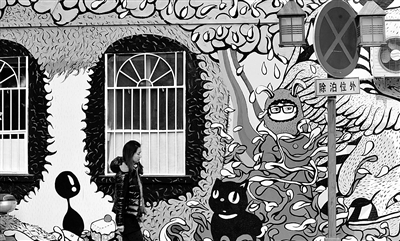 1月4日,行人从杭州沈塘桥路一幢楼房外墙的精美装饰画前走过。当日,在杭州沈塘桥路两幢刚刚拆除脚手架的楼房外墙上,绘满墙面的两幅图画以其强烈的视觉冲击力吸引了人们的眼球。 李 忠摄(新华社发)