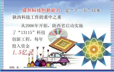 提升科技创新能力,是“十一五”以来陕西科技工作的重中之重。从2006年开始,陕西省启动实施了“13115”科技创新工程,每年投入资金1.5亿元,在10个重点领域,组织30个重大科技专项,攻克一批关键技术,开发一批名牌产品;在重点行业和企业支持建设100个产学研结合的工程技术研究中心,提升重点企业的科技创新能力和核心竞争力;重点扶持100个重大科技产业化项目,加速科技产业跨越发展,形成一批新的经济增长点;重点支持建好50个科技产业园区,充分发挥科技产业园区产业集聚作用和辐射带动作用。