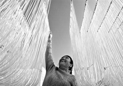 浙江省诸暨市马剑镇村民在晒手工面。当日,浙江省诸暨市马剑镇举行传统手工面制作技能比赛,二十多名制面高手在操场上现场制面,一决高低。 郭 斌摄(新华社发)