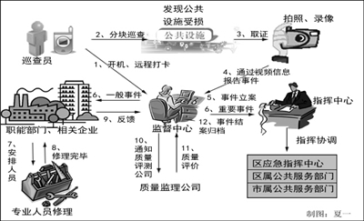 借助网格化管理,发生在东城区居民生活中的各种部件和事件问题,如井盖丢失、公共设施损坏、垃圾渣土堆集、占道经营、小广告等问题,流动巡视的监督员通过配备的“城管通”,通过城市管理特别服务号13910001000,就可以在第一时间、第一现场,将城市管理问题的各类信息及时发送到监督中心。