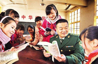 1月7日,福建省连江县公安边防官兵在粗芦岛小学和小学生一起交流学习。当日,福建省连江县公安边防官兵定期来到辖区内的粗芦岛小学开展“警校共建结对”活动,为孩子们普及法律知识,并送来一批“爱心”书籍,丰富他们的课外生活。 新华社记者 张国俊摄