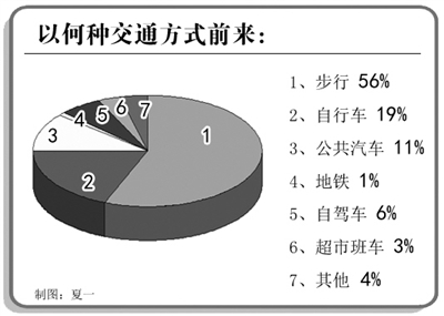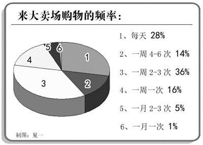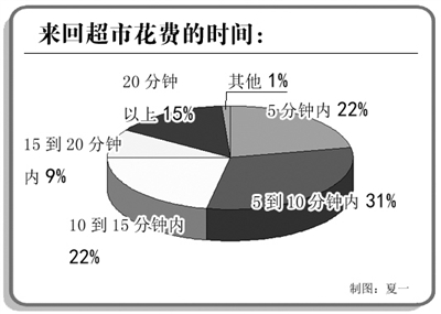 与西方国家的大卖场大多位于郊区不同,我国的大卖场大多位于城市里的繁华路段,因此消费者去大卖场买东西更加方便。比如从调查数据中可以看出,6大城市1800个样本中有超过50%的人群只需要花费10分钟便可到达大卖场。总体来看,我们认为我国大卖场消费者的购买行为特点是:路上花费时间短,购买频率高,但单次购买的金额较少。