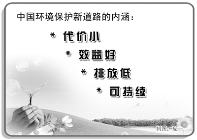 中国环境保护新道路的内涵主要是代价小、效益好、排放低、可持续。一是环境保护是重大民生问题,必须从事关民族兴衰、国家安全、人民福祉的高度来认识。二是环境问题是发展方式问题,必须把加快建设资源节约型、环境友好型社会作为我国未来发展的根本战略任务。三是环境保护是可持续发展的三大支柱之一,应成为优化经济发展的动力,贯穿于生产、流通、分配、消费的全过程。四是重要生态系统是国家生态安全的主体,事关国家安全,必须对不堪重负的生态系统实行休养生息。五是建设生态文明是落实科学发展观的应有之义,根本目标是实现人与自然和谐、经济发展与环境保护相协调。简单概括起来说,就是要探索一条代价小、效益好、排放低、可持续的环境保护新道路。