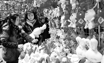 1月9日,市民在江西省南昌市万寿宫商城选购生肖兔饰物。春节将至,南昌市年味渐浓,各大商场、街道被节日饰品装扮一新,春节饰物销售红火。 新华社记者 周 科摄