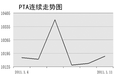 1月11日,PTA主力1105合约延续了上周后期的跌势,呈弱势整理格局。开盘价10484元/吨,最高10544元/吨,最低10330元/吨,收于10410元/吨,全天下跌16元/吨。现货方面,现货内盘PTA至10130元/吨,外盘1269元/吨,进口成本10525.67元/吨,涤丝价格总体稳定。