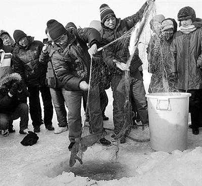 1月9日,渔民在哈尔滨白渔泡国家湿地公园凿开厚厚的冰面下网捕鱼。当日,哈尔滨白渔泡国家湿地公园举行一年一度的“白渔泡贡鱼节”。 陈 钢摄(新华社发)