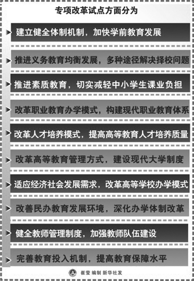 通知指出,在专项改革试点方面分为,建立健全体制机制,加快学前教育发展;推进义务教育均衡发展,多种途径解决择校问题;推进素质教育,切实减轻中小学生课业负担;改革职业教育办学模式,构建现代职业教育体系;改革人才培养模式,提高高等教育人才培养质量;改革高等教育管理方式,建设现代大学制度;适应经济社会发展需求,改革高等学校办学模式;改善民办教育发展环境,深化办学体制改革;健全教师管理制度,加强教师队伍建设;完善教育投入机制,提高教育保障水平。