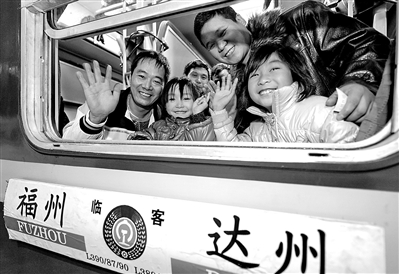 1月13日,乘坐临时列车返乡过年的四川籍农民工和他们的子女向送行亲友致意。 当日,福州火车站开出春运首趟农民工专列——福州至达州L390临时列车,1936名在闽务工人员和他们的家属搭乘此列火车返乡过年。 新华社记者 张国俊摄