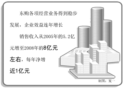东方资产在取得东购政策性股权后,并没有简单处置或被动等待分红,而是积极发挥法律赋予股东的合法权益,介入企业董事会、监事会、经营层,参与对东购的具体管理。其后,东方资产注意到持有东购55.14%股权的某投资公司及其子公司进入清理程序,为进一步提升所持东购股权价值,东方资产审时度势,迅速抓住投资机会,在获得人民银行有关工作组同意后,于2005年5月收购上述55.14%股权,成为持有东购92.73%股权的控股股东,进一步加强了对东购的管控,更换了新的管理层,并对购物中心、写字楼进行了全面的装修改造,继续坚持做一个“开明的股东、负责任的股东”。良好的企业管理使东购的股权价值得到了显著增值。自东方资产取得控股权后,东购各项经营业务得到稳步发展,企业效益连年增长,销售收入从2005年的5.2亿元增至2008年的8亿元左右,每年净增近1亿元。