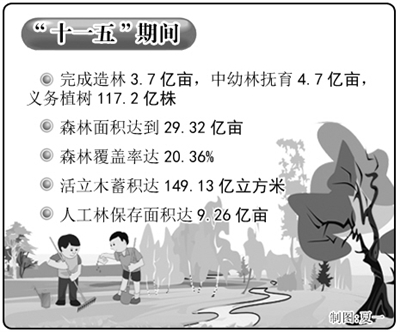 集体林改极大地促进了造林绿化,森林面积持续增长。“十一五”期间全国完成造林3.7亿亩,中幼林抚育4.7亿亩,义务植树117.2亿株。全国森林面积达到29.32亿亩,森林覆盖率达20.36%,活立木蓄积达149.13亿立方米。人工林保存面积达9.26亿亩,稳居世界首位。