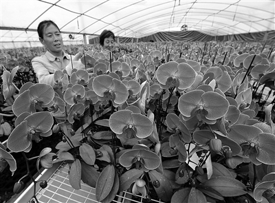 1月14日,工作人员在蝴蝶兰栽培温室里挑选蝴蝶兰,准备投放市场。近日,南京蔬菜花卉研究所花卉基地进入花卉生产经营旺季,1.3万平方米的花卉温室里繁花似锦,蝴蝶兰、凤梨花、红掌、大花蕙兰、杜鹃花等各种精品花卉正从这里批量投放市场。 新华社记者 孙 参摄