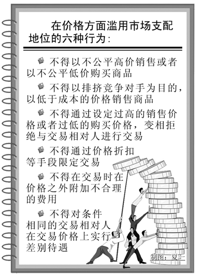 《反价格垄断规定》根据《反垄断法》第十七条的规定,将在价格方面滥用市场支配地位的行为细化为六种类型。具有市场支配地位的经营者,不得以不公平高价销售或者以不公平低价购买商品;不得以排挤竞争对手为目的,以低于成本的价格销售商品;不得通过设定过高的销售价格或者过低的购买价格,变相拒绝与交易相对人进行交易;不得通过价格折扣等手段限定交易;不得在交易时在价格之外附加不合理的费用;不得对条件相同的交易相对人在交易价格上实行差别待遇。