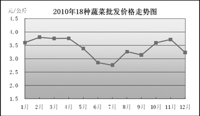 2010年11月中旬以来,随着稳定物价政策的贯彻落实,蔬菜市场货源增加,流通成本降低,全国蔬菜平均价格明显回落。2010年12月份,全国36个大中城市18种蔬菜批发价格为3.22元/公斤,环比下降13.4%,同比下降3.9%。