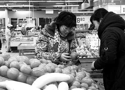 图②顾客在北京物美大卖场选购农超对接西红柿。 本报记者 王小聪摄