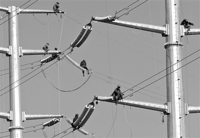 1月16日,几名电力职工在高压铁塔上安装导线。 当日,经过江苏省无锡供电公司110多名职工连续5天的紧张施工,京沪高铁无锡段专用供电线路顺利完工,确保了无锡段通车试运行的电源供应。 潘正光摄 (新华社发)