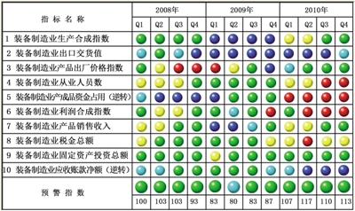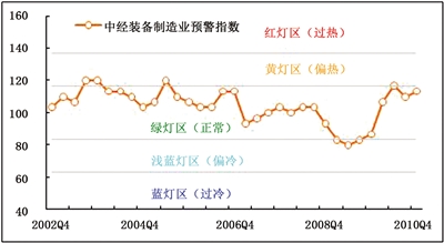 预警:2010年四季度,中经装备制造业预警指数为113.3点,较上季度提升3.3点,继续在“绿灯区”偏上位置运行,表明行业运行继续维持在正常偏暖的状态。