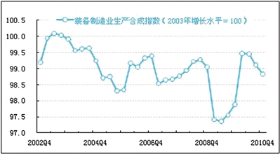 经初步季节调整,2010年四季度,我国装备制造业生产合成指数为98.8点(2003年增长水平=100),比上季度小幅回落0.3点。