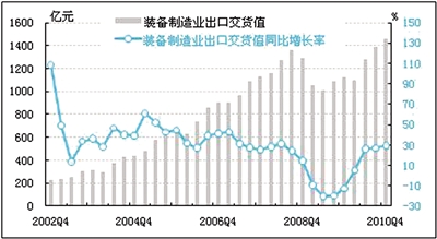 2010年四季度,装备制造业出口交货值占装备制造业产品销售收入的比重为9.5%,连续第二个季度比上季度微升0.1个百分点,表明出口需求的恢复与国内需求的增长基本上同步。