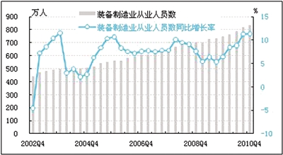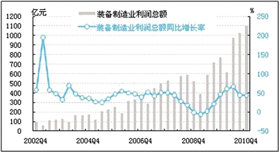 综上所述,四季度装备制造业的生产保持平稳增长,销售则继续呈现较快增长态势,行业产销衔接良好。需要指出的是,经过测算,在2010年四季度产品销售收入中,随机因素(政策影响因素等)带来了约785.44亿元收入的增加。