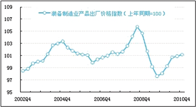 2010年四季度,装备制造业产品出厂价格比去年同期微涨1.2个百分点,连续三个季度保持价格上涨态势且涨幅有所提升。其中,专用设备制造业和通用设备制造业产品出厂价格分别上涨1.7%和0.9%。