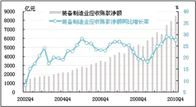 2010年四季度末,装备制造业的应收账款净额为8526.2亿元,同比增长27.6%,增幅比上季度微落1.2个百分点。应收账款的周转天数没有出现大的变动,为48天,比三季度仅多出1天。应收账款增速继续低于销售收入增速,且增幅回落,表明企业回笼资金效果良好。