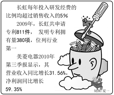 长虹旗下美菱冰箱以0.25千瓦时成就了冰箱节能的新高度,已远远低于欧洲的能耗标准。据统计,美菱冰箱2010年1至10月零售额同比增长25.09%,零售量同比增长23.57%。