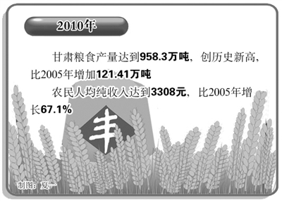 本报讯 记者李琛奇、通讯员陈发明报道:近年来,甘肃不断优化农业产业结构,发展壮大优势特色产业,推进农业产业化经营,依靠农业科技进步,使农业综合生产能力显著提高。2010年,甘肃粮食产量达到958.3万吨,创历史新高,比2005年增加121.41万吨;农民年人均纯收入达到3308元,比2005年增长67.1%;农业增加值达到575亿元,“十一五”期间年均增长5.38%。