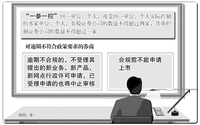 按照要求,证券公司的股东、实际控制人、股权的实际控制人应在2010年12月31日前达到《意见》的要求。不符合“一参一控”监管要求的证券公司,应当在2009年12月31日前提交措施可行、时限明确的规范整改计划,承诺按照规定时限达到监管要求。