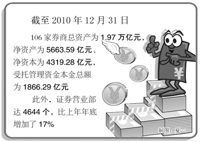 根据券商未经审计财务报告统计显示,106家证券公司全年实现营业收入1911.02亿元,各主营业务收入分别为:证券经纪业务及服务净收入1084.90亿元,证券承销与保荐及财务顾问业务净收入272.32亿元,受托客户资产管理业务净收入21.83亿元,证券投资收益(含公允价值变动)206.76亿元。此外,106家券商2010年全年累计实现净利润775.57亿元,虽然这一数字比2009年下降了16.85%,但相比2009年有两家券商亏损的情况,2010年106家券商全部实现了盈利。