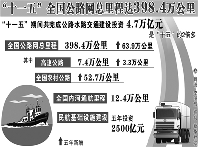 据介绍,“十一五”期间,我国交通运输基础设施建设进一步加快,网络更趋完善,结构更加优化。“十一五”期间共完成公路、水路交通建设投资4.7万亿元,是“十五”时期的2倍多,民航基础设施建设5年投资2500亿元。全国公路网总里程达398.4万公里,五年新增63.9万公里;高速公路总里程达7.4万公里,新增3.3万公里。“五纵七横”12条国道主干线提前13年全部建成,西部开发8条省际通道基本贯通。全国农村公路五年新增里程52.7万公里,全国所有具备条件的乡镇都通了公路。沿海港口5年建成深水泊位661个,新增通过能力30亿吨。新增及改善内河航道4181公里,全国内河通航里程达12.4万公里,初步形成了国家高等级航道网络。民航定期航班机场达到176个,5年新增35个。邮政基础设施补建空白乡镇邮政局所2500多个,改造西部及农村邮政局所7000多个。