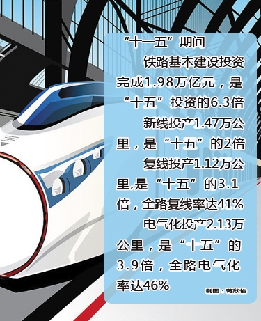 全国铁路基本建设投资在“十一五”期间完成1.98万亿元,是“十五”投资的6.3倍;新线投产1.47万公里,是“十五”的2倍;复线投产1.12万公里、电气化投产2.13万公里,分别为“十五”的3.1倍和3.9倍。全路复线率、电气化率分别达到41%、46%。