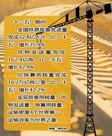 “十一五”期间,全国铁路旅客发送量完成72.8亿人次,比“十五”增长35.9%;货物发送量完成162.4亿吨,比“十五”增长42.9%;总换算周转量完成16.2万亿吨公里,比“十五”增长42.2%。