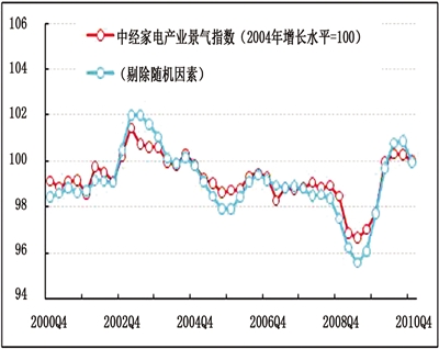 景气:2010年四季度,中经家电产业①景气指数为100.0点(2004年=100②),比上季度略微下降0.3点③。