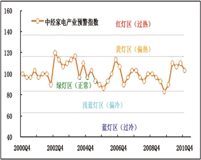 预警:2010年四季度,中经家电产业预警指数为103.3点,较上季度下降6.7点,目前仍运行于“绿灯区”中心线以上。
