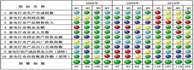 灯号:在构成中经家电产业预警指数的10个指标(仅剔除季节因素,保留随机因素)中,位于“红灯区”的有1个指标——家电行业产品销售收入;位于“黄灯区”的有2个指标——家电行业产品出厂价格指数和从业人员;位于“绿灯区”的有5个指标——家电行业生产合成指数、出口合成指数、利润总额、税金总额和固定资产投资;位于“浅蓝灯区”的有1个指标——家电行业产成品资金占用(逆转);位于“蓝灯区”的有1个指标——家电行业应收账款(逆转⑥)。