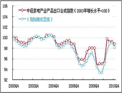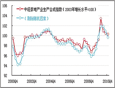 2010年四季度,家电行业生产合成指数为100.3点(2003年增长水平=100),比上季度小幅回落0.2点。在构成家电行业生产合成指数的4个指标中,经季节调整剔除季节因素后,空调、电冰箱产量同比增速较上季度有所加快;洗衣机、彩电产量同比增速较上季度有所回落。