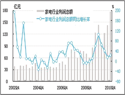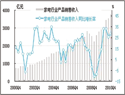 展望2011年一季度,家电行业销售收入有望保持继续增长,同比增速受到基数的影响有可能出现回落,但大幅回落的可能性不大。