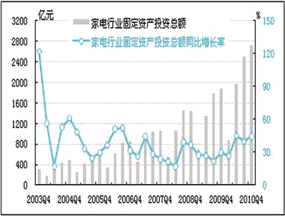 2010年四季度,经初步季节调整,家电行业固定资产投资总额为2724.4亿元,同比增长44.6%,同比增速较上季度加快4.6个百分点。